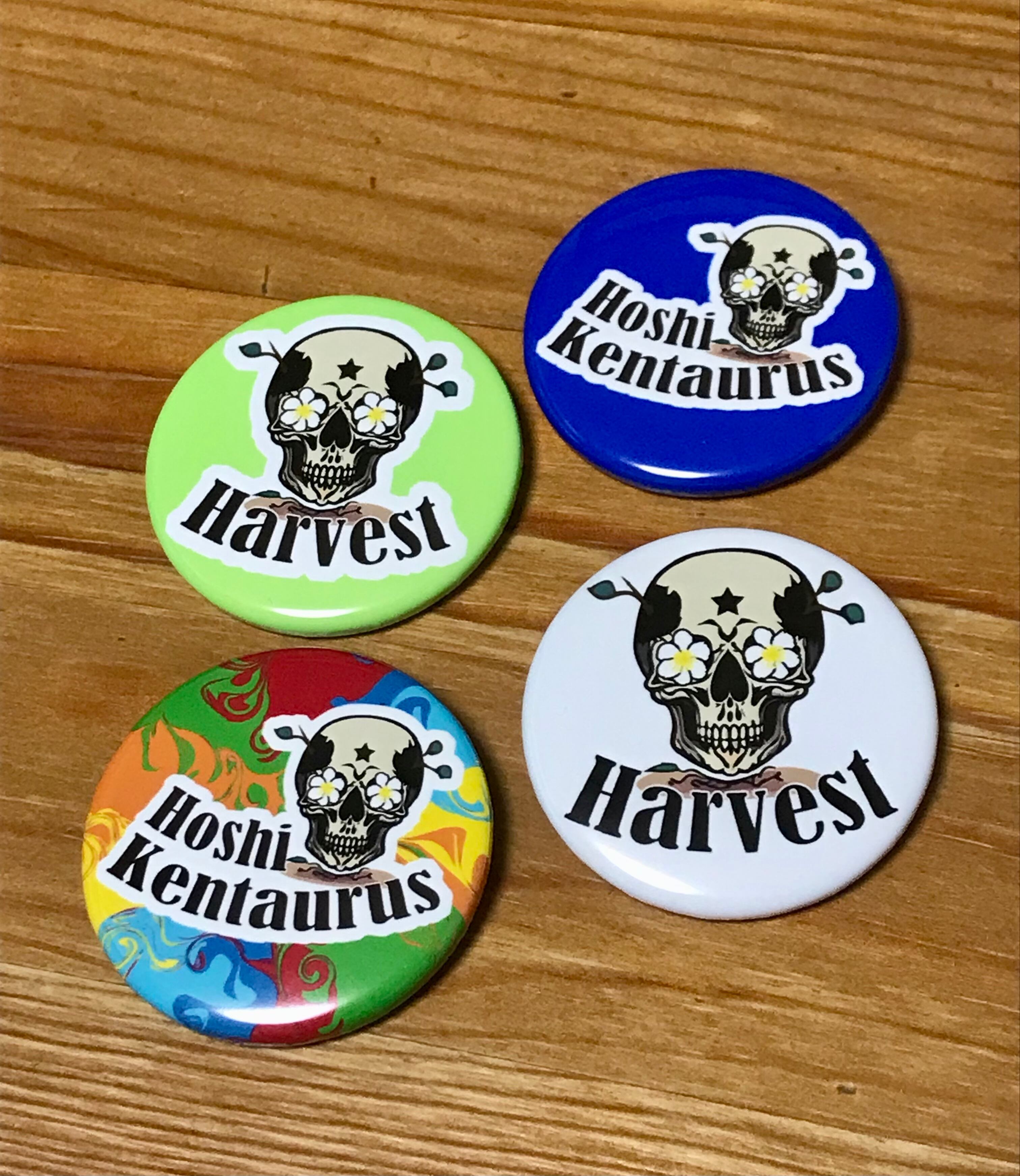 2ndEP「Harvest」のジャケットアートワークを担当したAKIYO。彼女のデザインによるロゴマークが缶バッジになりました!アルバムタイトルロゴとアーティストロゴ(Hoshi Kentaurus)の2種類に各2色展開。タイトルロゴはCDの帯の色と同じホワイト、そしてキウイを思わせるグリーンの2種類。アーティストロゴはデニムブルーと、サイケデリック柄の2種類となっております。サイズは44mm。帽子やリュックに付けるのに丁度いいサイズです!